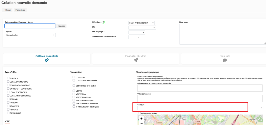 Lors de la saisie d’une demande, vous avez la possibilité d’indiquer que le client recherche dans un ou plusieurs secteurs
