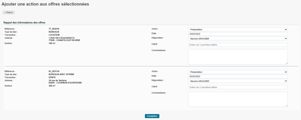 Vous aurez un récapitulatif des offres sélectionnées puis des informations sur l’action à remplir. Lorsque vous avez tout rempli, cliquez sur Enregistrer et l’action s’ajoutera automatiquement dans l’onglet « Actions cciales » des offres.