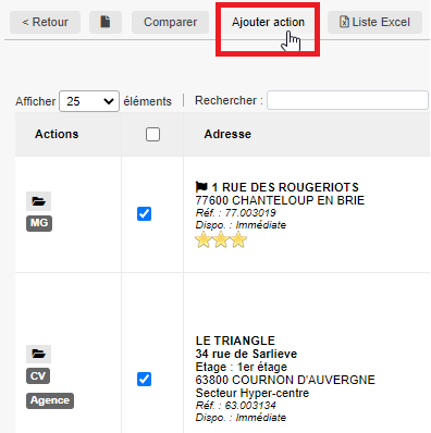 Faites une sélection d’offres en cochant celles auxquelles vous voulez ajouter l’action commerciale, puis cliquez sur le bouton « Ajouter action ».