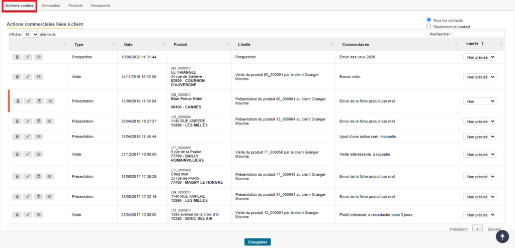 Après avoir été dans Contacts – Contacts actives et choisi le client voulu, cliquez sur l’onglet « Actions cciales ». Vous retrouverez toutes les actions commerciales liées à votre contact.