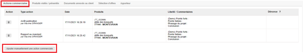 Après avoir été dans Demandes – Demandes actives et choisi la demande souhaitée, allez dans l’onglet « Actions cciales » puis cliquez sur « Ajouter manuellement une action commerciale » et rentrez le type d’action, la date et le commentaire.