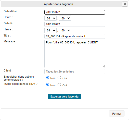 Informations préremplies, choisir la date et le client lié à l’offre puis « Exporter sous Outlook ».