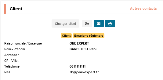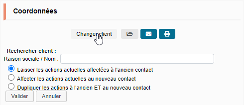 Cliquez sur « Changer client » et rentrez le nom de votre nouvel interlocuteur dans le bloc « Coordonnées ».