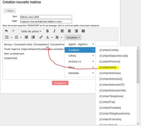 A l’aide des variables proposées, retravaillez votre texte. Ces champs seront ensuite remplacées au moment du « publipostage », juste avant l’envoi.
