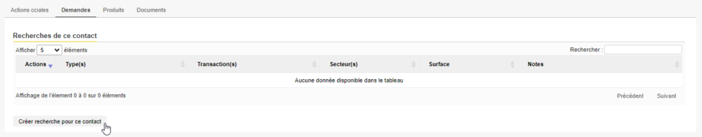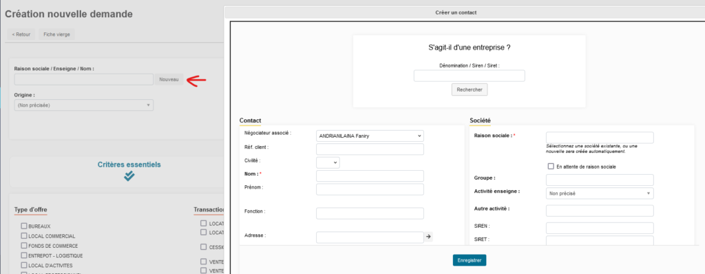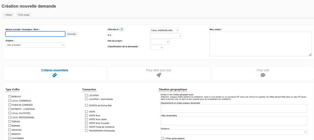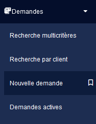 Appuyez ensuite sur « Créer recherche pour ce client » et la page « Création nouvelle demande » s’ouvrira.