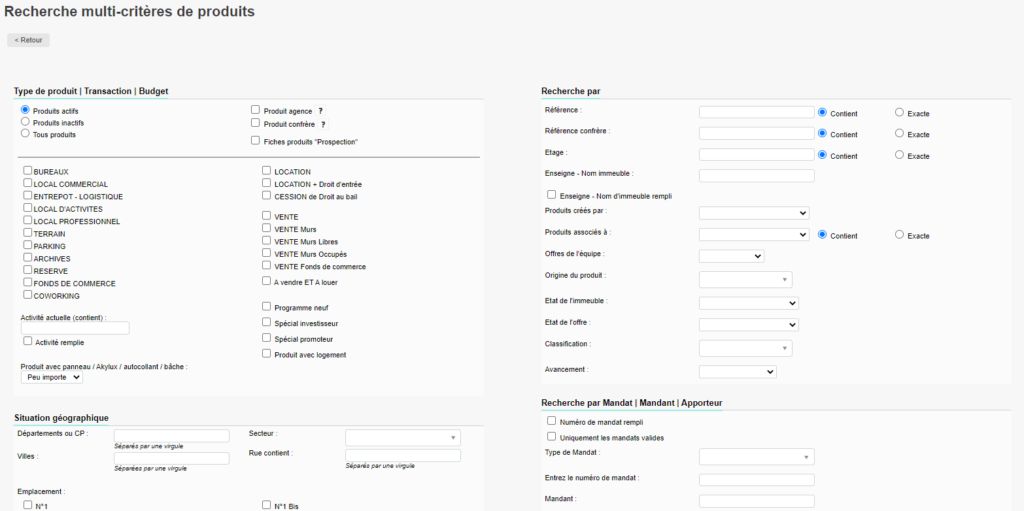 Comme la première technique, choisissez, grâce aux menus déroulants, le type de produit et le type de transaction que vous recherchez. Et veillez à indiquer les surfaces de l’offre.