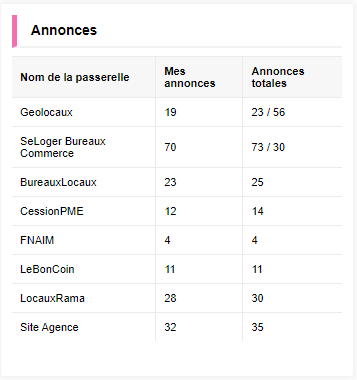 Vous pouvez également visualiser la liste des annonces transmises sur un site précis directement depuis le pavé Annonces de l’accueil :