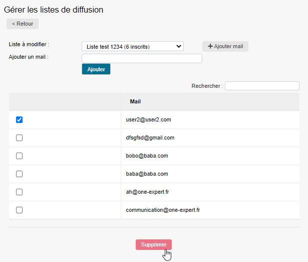 Sélectionnez la liste à modifier dans le menu déroulant puis cochez les mails des clients à retirer de la liste.