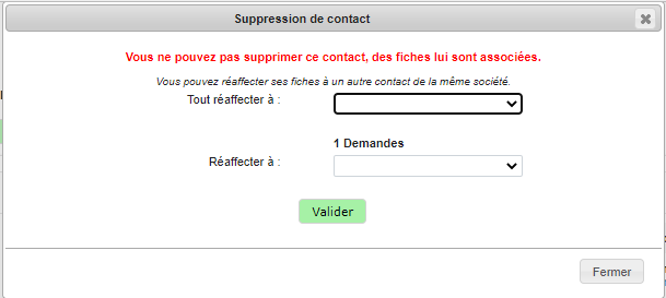 Pour chaque élément trouvé, on vous demandera ce que vous souhaitez réaffecter et à qui. Les fiches sont réaffectées obligatoirement à un contact provenant de la même agence.