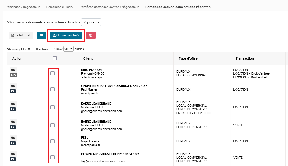 Cochez ensuite les demandes que vous souhaitez actualiser et cliquez sur « En recherche ? « .