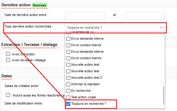 Si vous souhaitez retrouver vos demandes qui ont été relancées pour lesquelles vous n’avez pas reçu de réponse, vous pourrez aller dans la recherche multicritère des demandes et rechercher les demandes qui ont pour dernière action commerciale « Toujours en recherche ? «