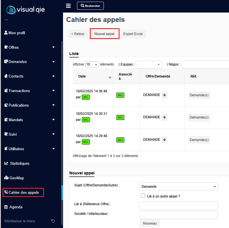 Pour ajouter un nouvel appel, allez dans le menu « Cahier des appels » puis cliquez sur « Nouvel appel » :