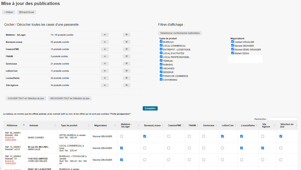 Grâce au bloc « Filtres d’affichage » vous pouvez sélectionner éventuellement les types de produits et le négociateur dont vous voulez voir les publications sur les sites.